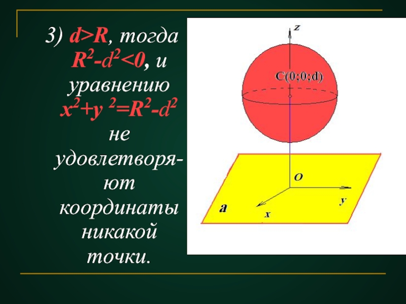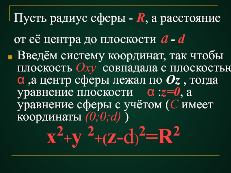 Введём систему координат, так чтобы плоскость Оху совпадала с плоскостью α ,а центр сферы лежал по Оz , тогда уравнение плоскости α :z=0, а уравнение сферы с учётом (С имеет координаты (0;0;d) )