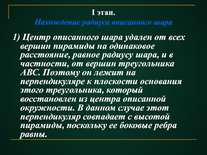всех вершин пирамиды на одинаковое расстояние, равное радиусу шара, и в частности, от вершин треугольника АВС. Поэтому он лежит на перпендикуляре к плоскости основания этого треугольника, который восстановлен из центра описанной окружности. В данном случае этот перпендикуляр совпадает с высотой пирамиды, поскольку ее боковые ребра равны.