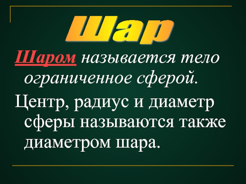 находящихся на заданном расстоянии от данной точки. Эта точка называется центром, а заданное расстояние – радиусом сферы, или шара – тела, ограниченного сферой. Шар состоит из всех точек пространства, находящихся на расстоянии не более заданного от данной точки.
