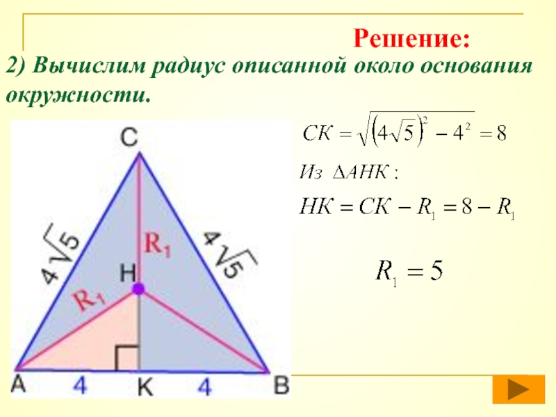 Слайд 462) Вычислим радиус описанной около основания окружности.