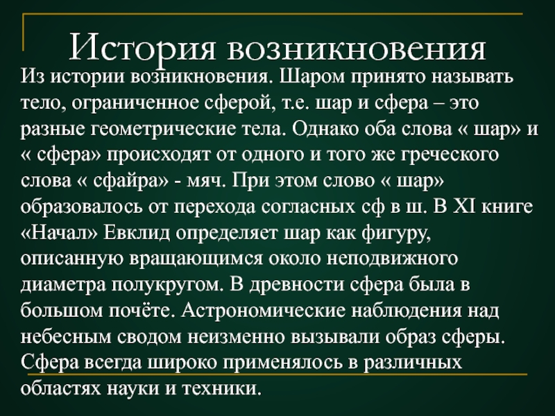 шар и сфера – это разные геометрические тела. Однако оба слова « шар» и « сфера» происходят от одного и того же греческого слова « сфайра» - мяч. При этом слово « шар» образовалось от перехода согласных сф в ш. В XI книге «Начал» Евклид определяет шар как фигуру, описанную вращающимся около неподвижного диаметра полукругом. В древности сфера была в большом почёте. Астрономические наблюдения над небесным сводом неизменно вызывали образ сферы. Сфера всегда широко применялось в различных областях науки и техники.