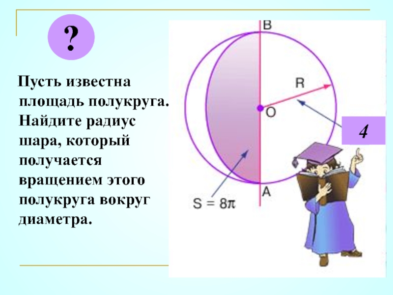 Слайд 10 Пусть известна площадь полукруга. Найдите радиус шара, который получается