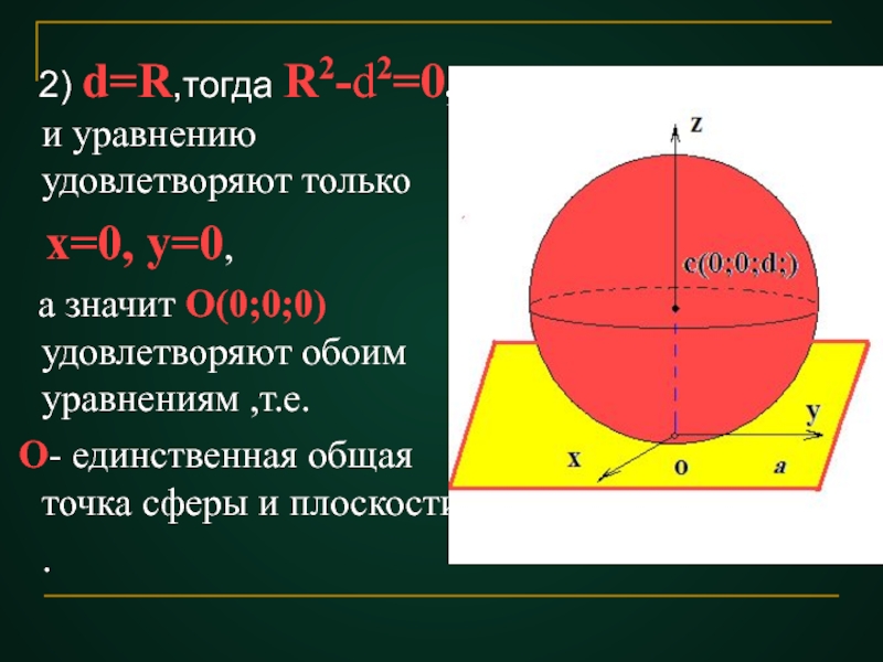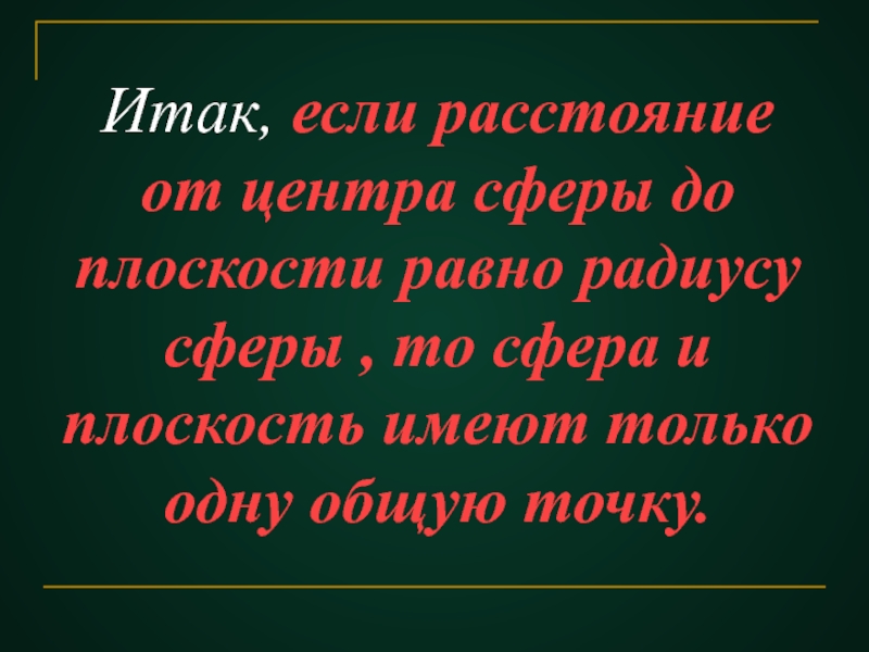 Слайд 29Итак, если расстояние от центра сферы до плоскости равно радиусу сферы