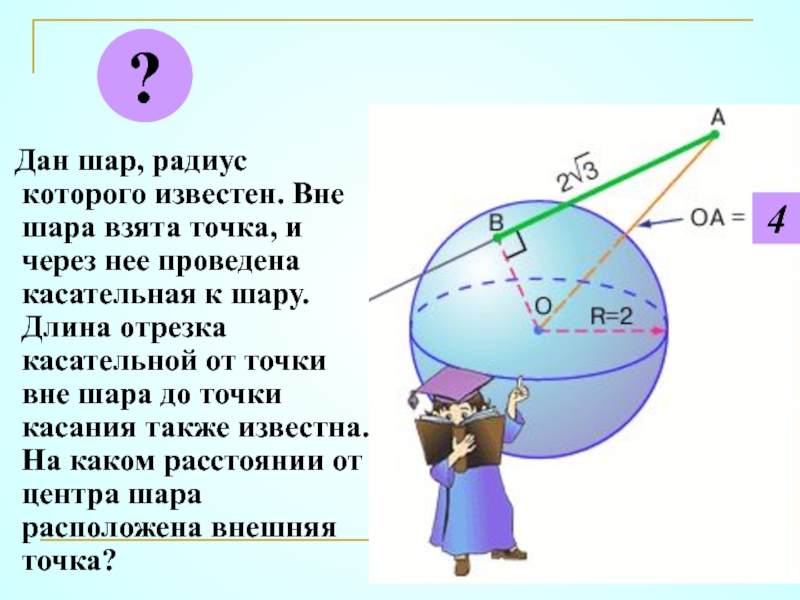 Слайд 36 Дан шар, радиус которого известен. Вне шара взята точка,