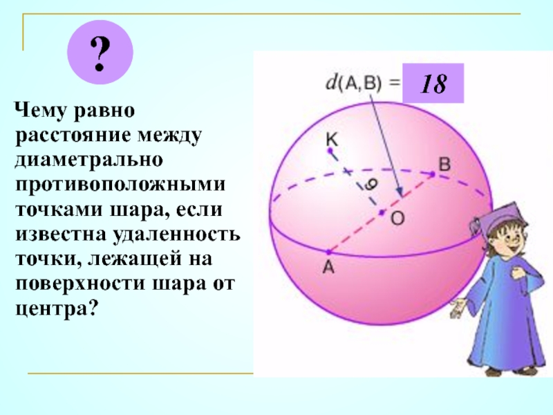 Слайд 9 Чему равно расстояние между диаметрально противоположными точками шара, если