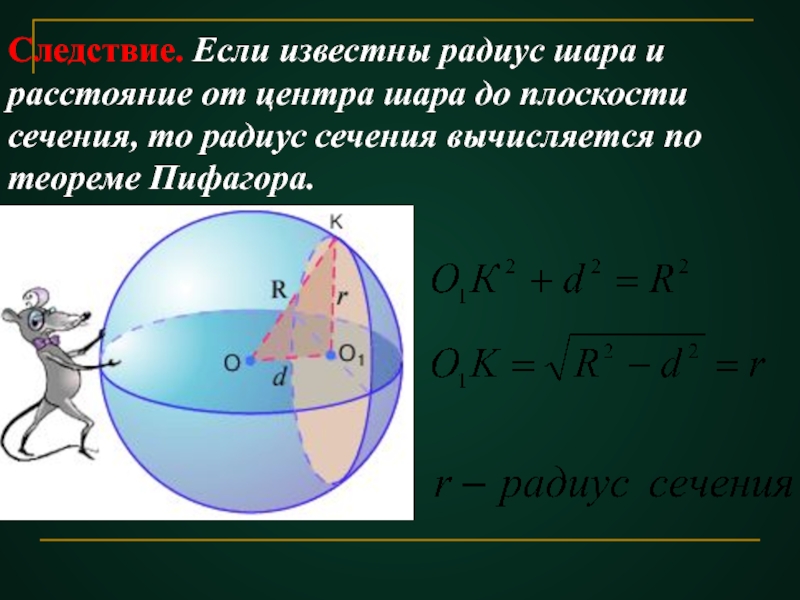 Слайд 13Следствие. Если известны радиус шара и расстояние от центра шара до