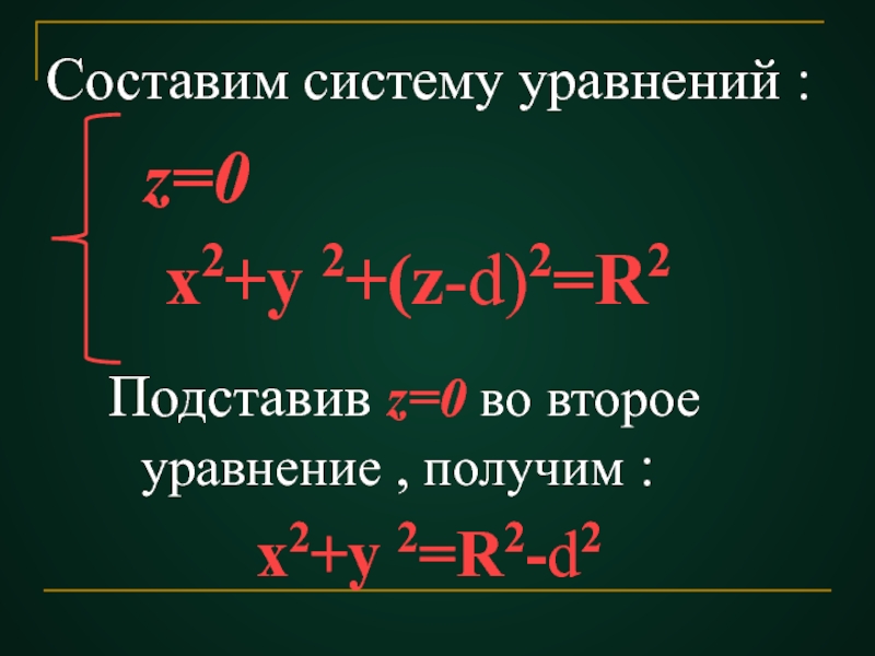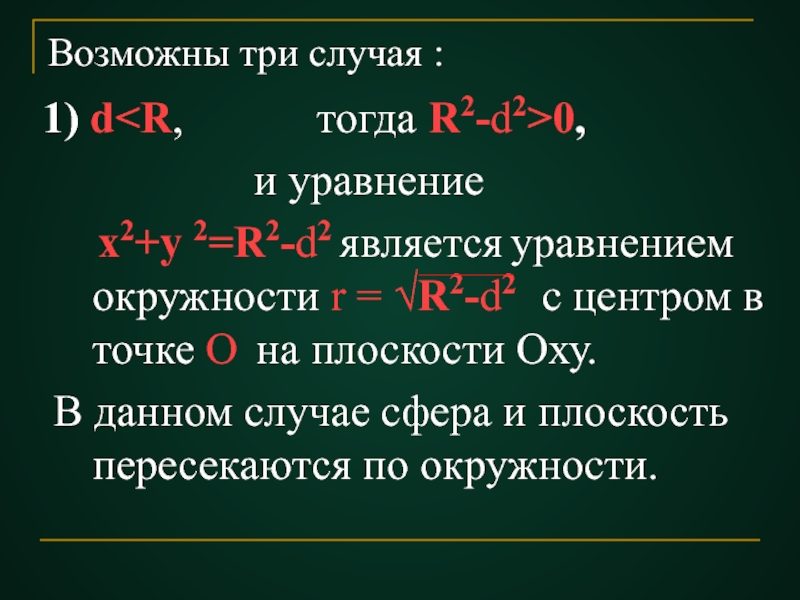 х2+у 2=R2-d2 является уравнением окружности r = √R2-d2 с центром в точке О на плоскости Оху.