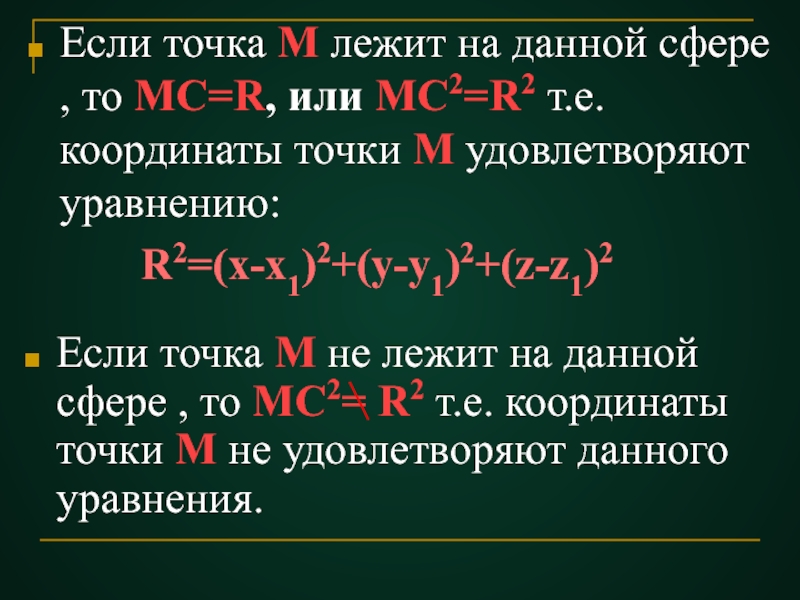 Если точка М не лежит на данной сфере , то МС2= R2 т.е. координаты точки М не удовлетворяют данного уравнения.