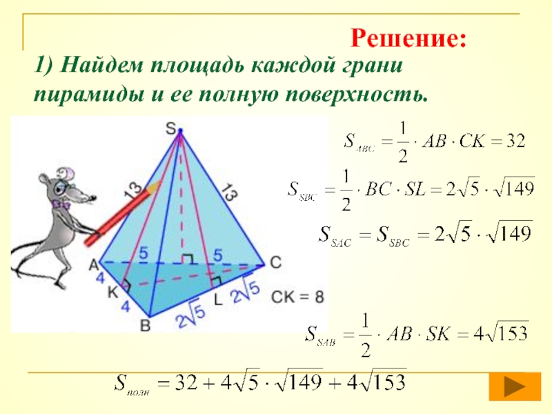 Слайд 501) Найдем площадь каждой грани пирамиды и ее полную поверхность.