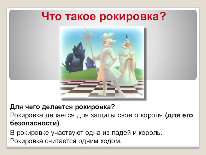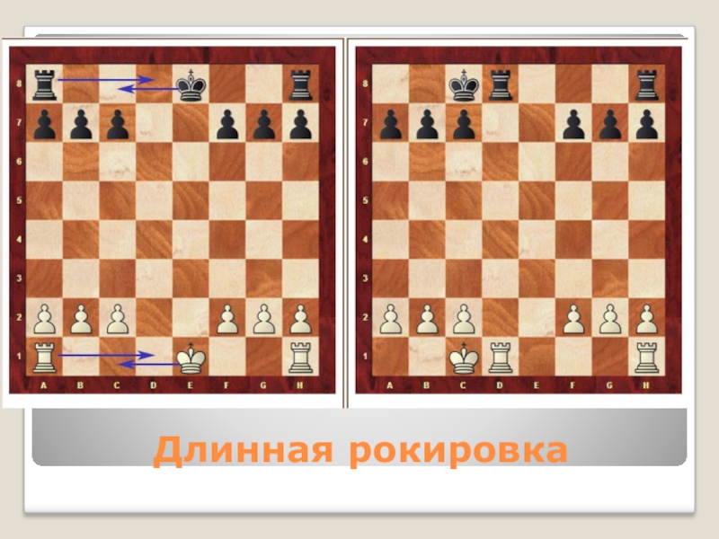 Рокировка в сторону королевского фланга – короткая рокировка Рокировка в сторону ферзевого фланга – длинная рокировка