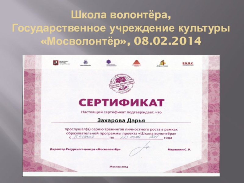 Слайд 1Школа волонтёра, Государственное учреждение культуры «Мосволонтёр», 08.02.2014