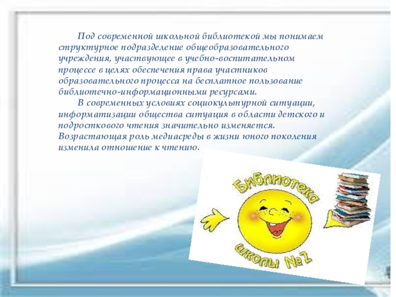 Слайд 3Под современной школьной библиотекой мы понимаем структурное подразделение общеобразовательного учреждения, участвующее в учебно-воспитательном