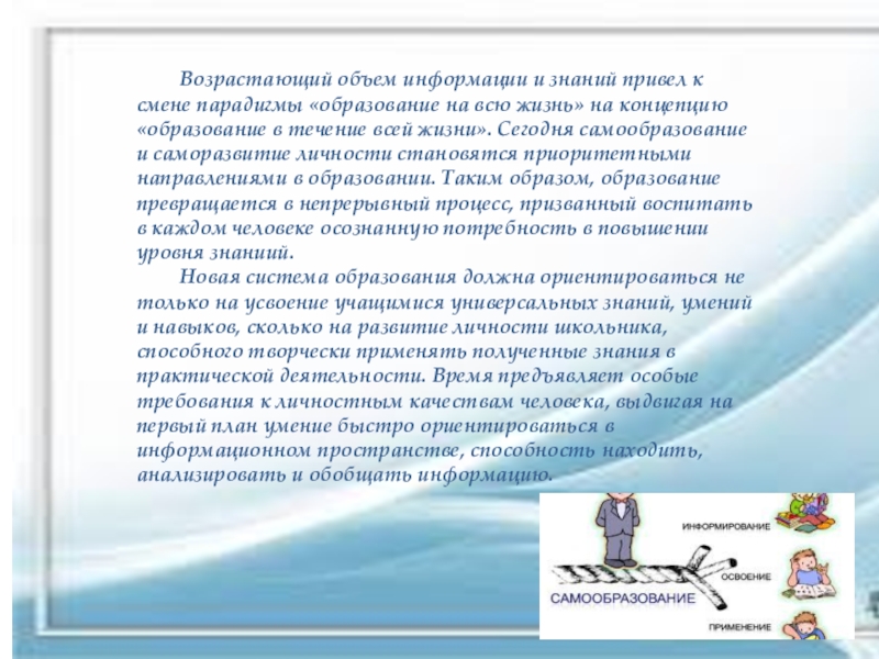 всю жизнь» на концепцию «образование в течение всей жизни». Сегодня самообразование и саморазвитие личности становятся приоритетными направлениями в образовании. Таким образом, образование превращается в непрерывный процесс, призванный воспитать в каждом человеке осознанную потребность в повышении уровня знаниий.