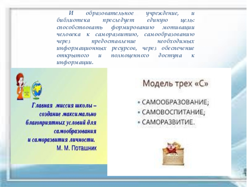 библиотеки и библиотекаря-педагога очень велико и постоянно возрастает. Это связано с повышением роли школьных библиотекарей как специалистов по работе с информацией, с одной стороны, и консультантов и педагогов, обучающих работе с информацией, – с другой.