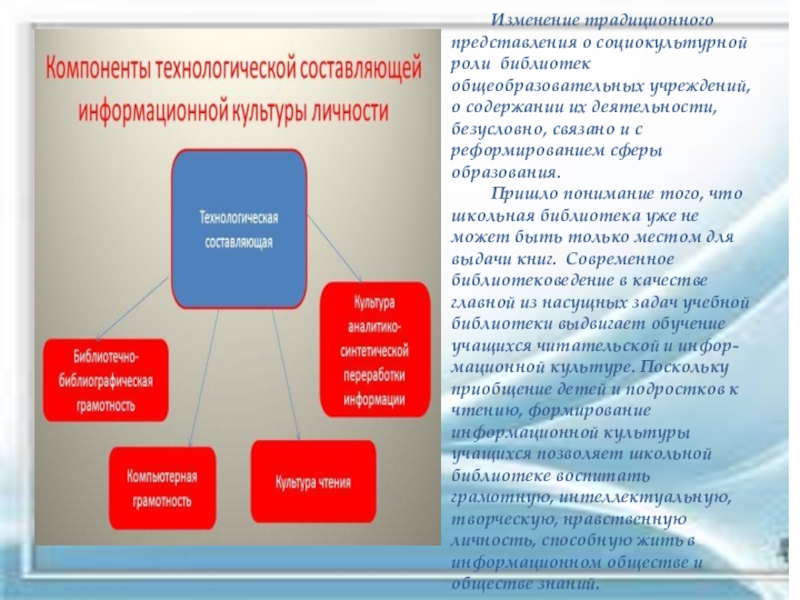 Слайд 9Изменение традиционного представления о социокультурной роли библиотек общеобразовательных учреждений, о содержании