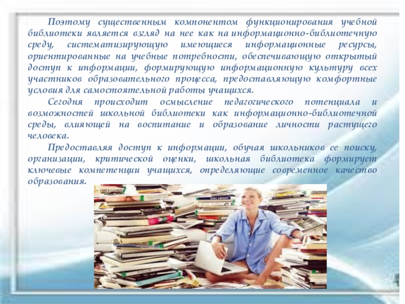 Поэтому существенным компонентом функционирования учебной библиотеки является взгляд на нее как