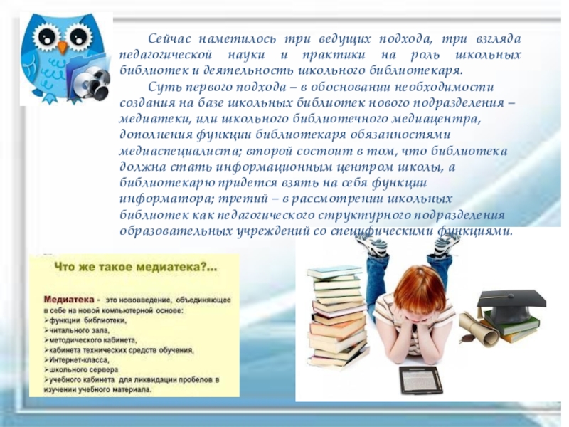 Суть первого подхода – в обосновании необходимости создания на базе школьных библиотек нового подразделения – медиатеки, или школьного библиотечного медиацентра, дополнения функции библиотекаря обязанностями медиаспециалиста; второй состоит в том, что библиотека должна стать информационным центром школы, а библиотекарю придется взять на себя функции информатора; третий – в рассмотрении школьных библиотек как педагогического структурного подразделения образовательных учреждений со специфическими функциями.