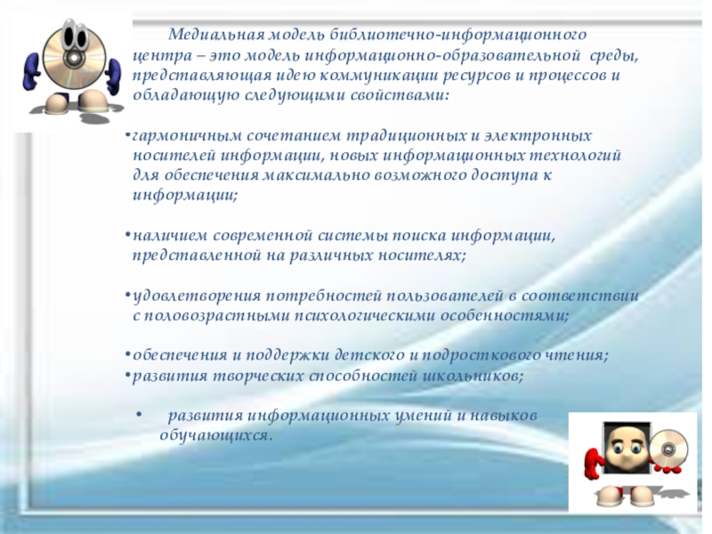 Слайд 13Медиальная модель библиотечно-информационного центра – это модель информационно-образовательной среды, представляющая идею коммуникации ресурсов и процессов и