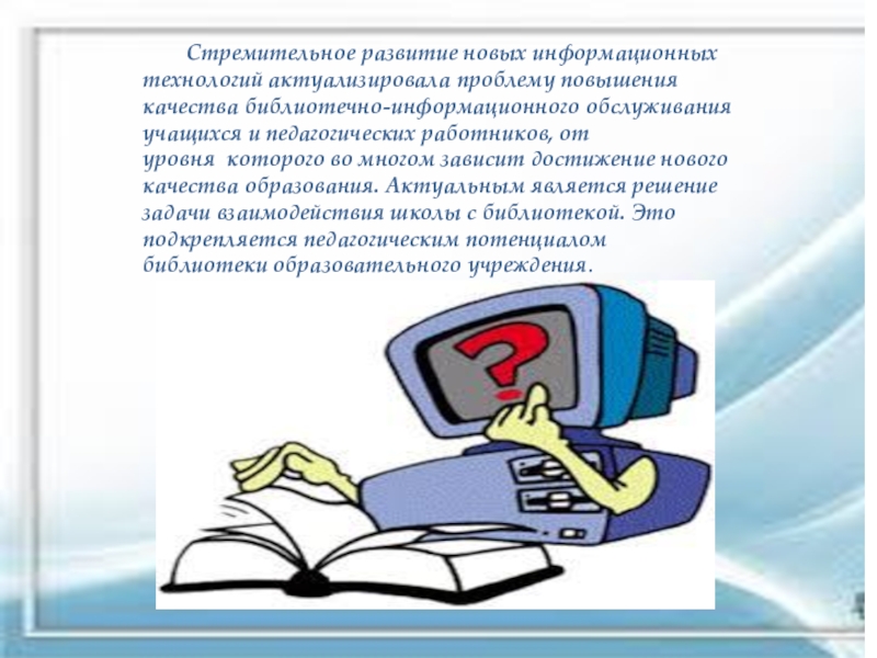 Слайд 6Стремительное развитие новых информационных технологий актуализировала проблему повышения качества библиотечно-информационного обслуживания