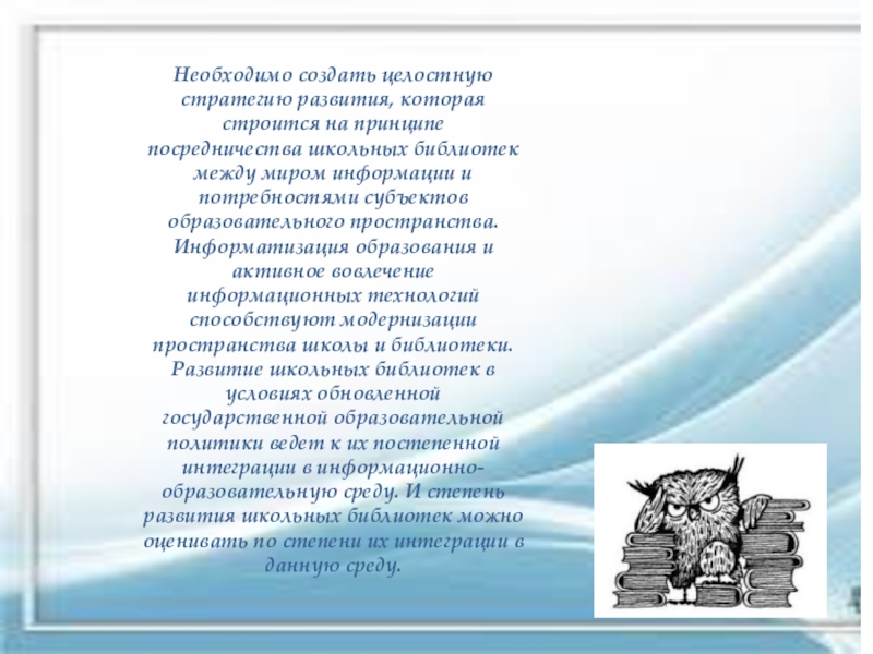информационно-коммуникационной среды требует создания образовательной системы, что позволит избежать отрыва качества образования от современных требований жизни в информационном обществе. Развитие школьных библиотек ведет к их постепенной интеграции в информационно-образовательную среду. Степень развития школьных библиотек можно оценивать по степени их интеграции в данную среду. Современная стратегия развития школьной библиотеки строится на принципе посредничества библиотеки между миром информации и потребностями субъектов образовательной среды. Концепция доступа к информации дополняется активной ролью библиотеки как посредника, связующего звена между информацией и пользователем.