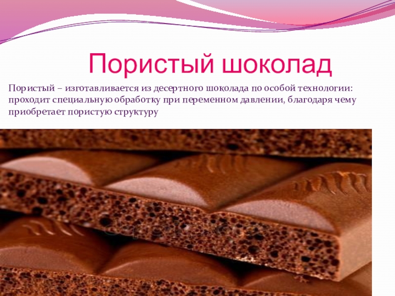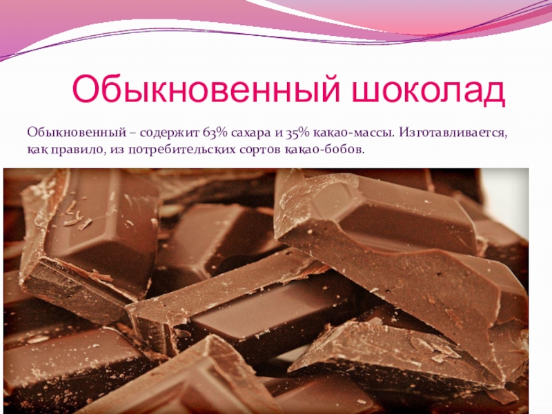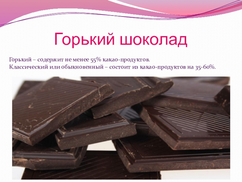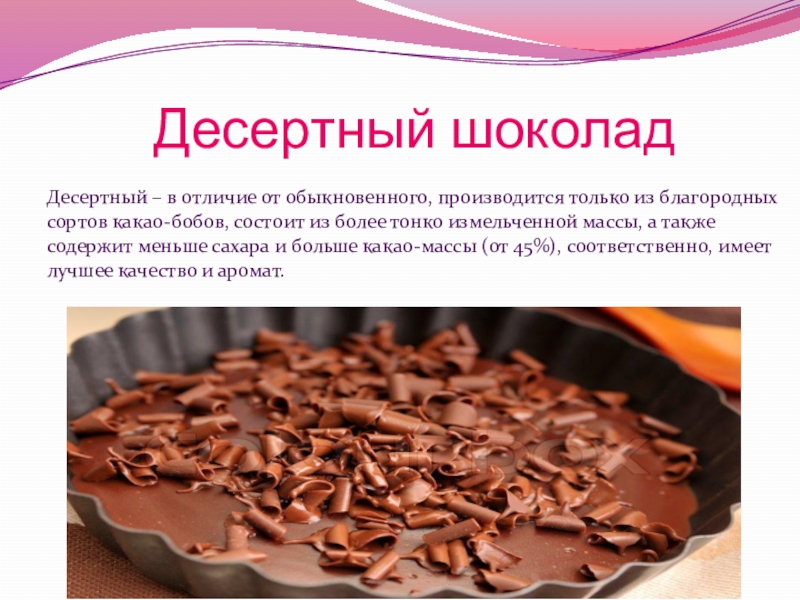 Десертный – в отличие от обыкновенного, производится только из благородных сортов какао-бобов, состоит из более тонко измельченной массы, а также содержит меньше сахара и больше какао-массы (от 45%), соответственно, имеет лучшее качество и аромат.