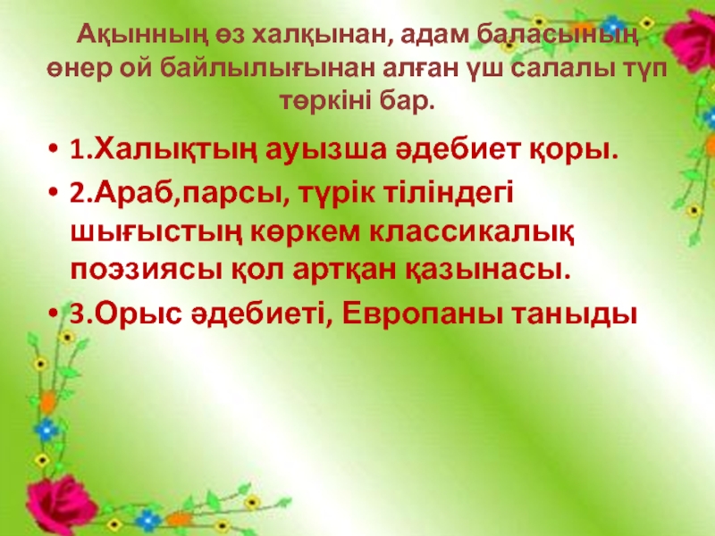 э) дамытушылық: ой-өрісін, ойлау белсенділігін, сөйлеу шеберлігін, тіл мәдениетін дамыту, сөздік қорын молайту, шығармашылық ізденіске баулу.