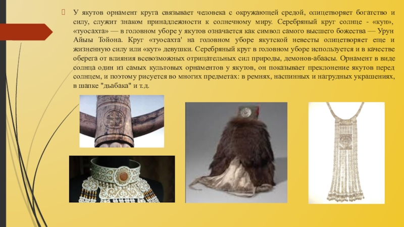 Слайд 12У якутов орнамент круга связывает человека с окружающей средой, олицетворяет богатство