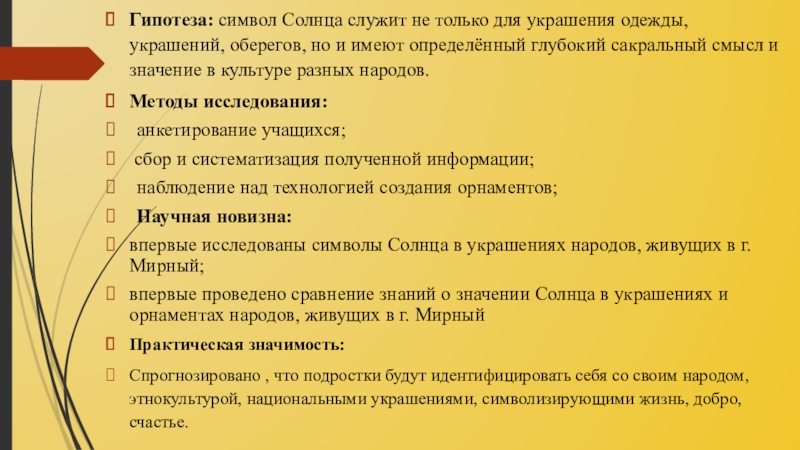 Слайд 3Гипотеза: символ Солнца служит не только для украшения одежды, украшений, оберегов,