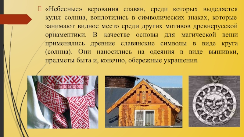 Слайд 11«Небесные» верования славян, среди которых выделяется культ солнца, воплотились в символических
