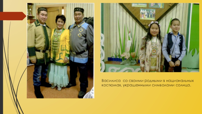 Слайд 25Василиса со своими родными в национальных костюмах, украшенными символами солнца.