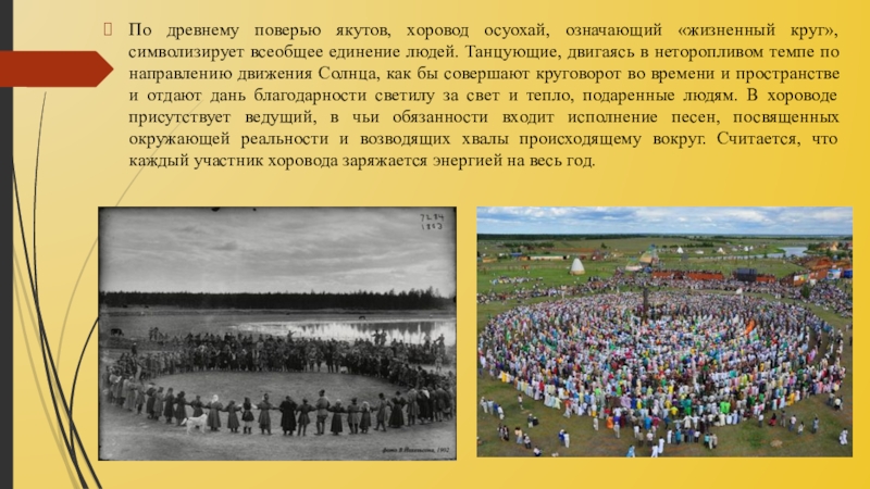 Слайд 9По древнему поверью якутов, хоровод осуохай, означающий «жизненный круг», символизирует всеобщее