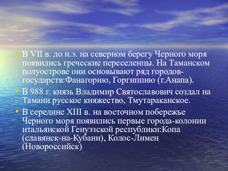 В середине XIII в. на восточном побережье Черного моря появились первые города-колонии итальянской Генуэзской республики:Копа (славянск-на-Кубани), Колос-Лимен (Новороссийск)