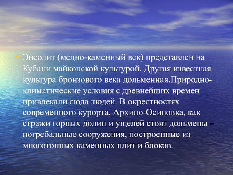 Энеолит (медно-каменный век) представлен на Кубани майкопской культурой. Другая известная культура