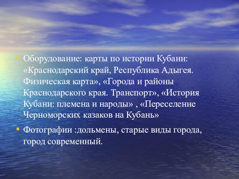 Оборудование: карты по истории Кубани: «Краснодарский край, Республика Адыгея. Физическая карта»,