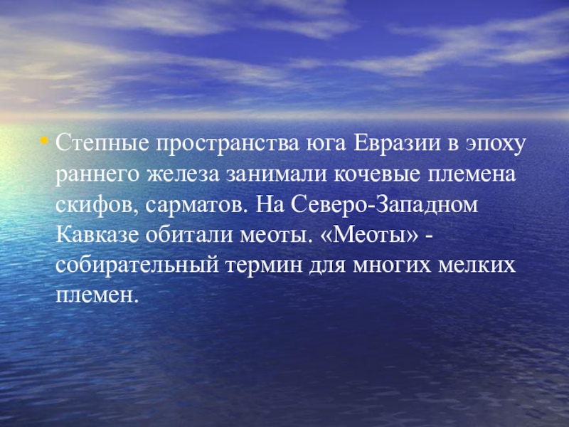 скифов, сарматов. На Северо-Западном Кавказе обитали меоты. «Меоты» - собирательный термин для многих мелких племен.