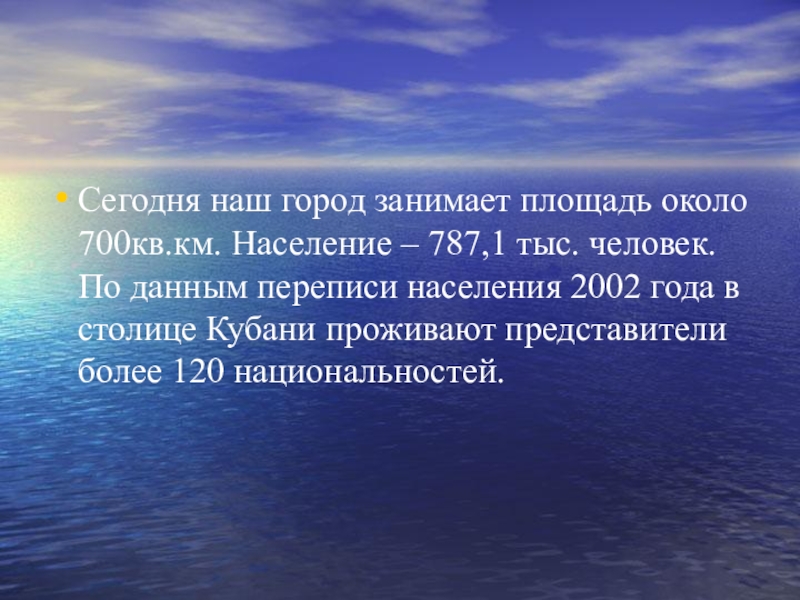 человек. По данным переписи населения 2002 года в столице Кубани проживают представители более 120 национальностей.
