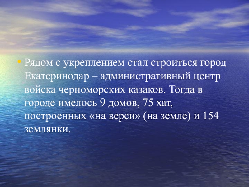 черноморских казаков. Тогда в городе имелось 9 домов, 75 хат, построенных «на верси» (на земле) и 154 землянки.