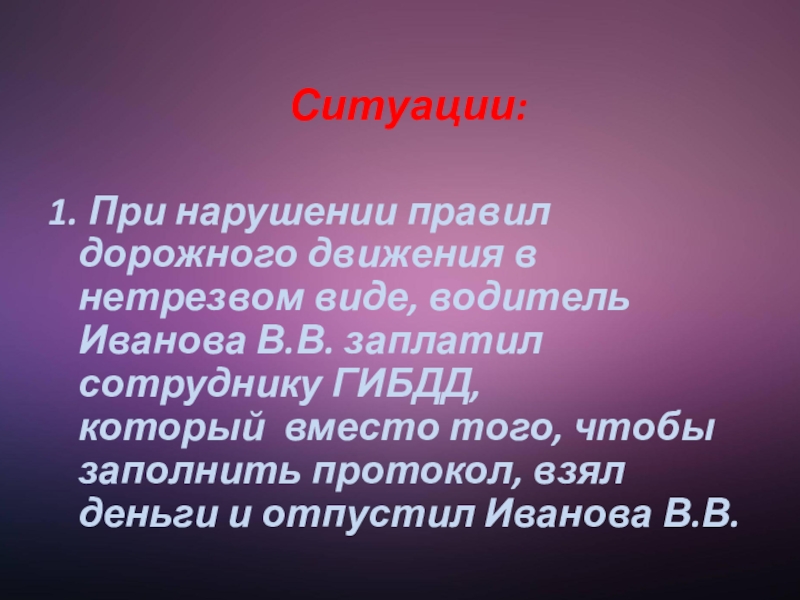В.В. заплатил сотруднику ГИБДД, который вместо того, чтобы заполнить протокол, взял деньги и отпустил Иванова В.В.