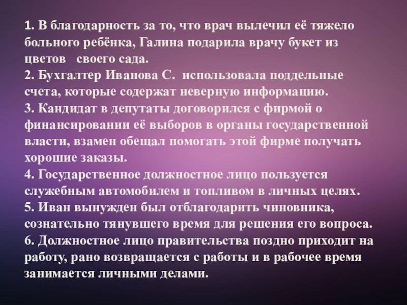 6. Должностное лицо правительства поздно приходит на работу, рано возвращается с работы и в рабочее время занимается личными делами.