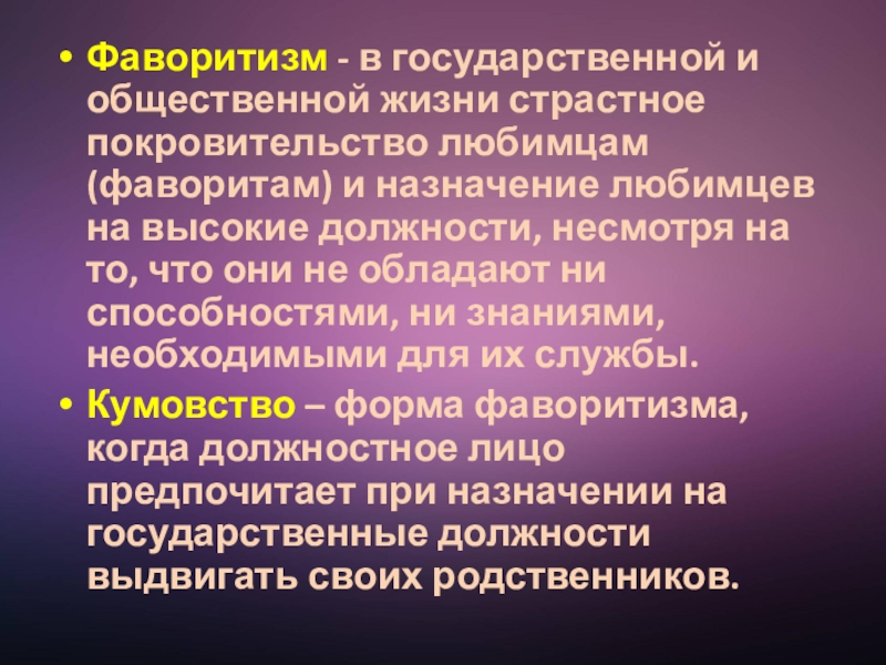 Кумовство – форма фаворитизма, когда должностное лицо предпочитает при назначении на государственные должности выдвигать своих родственников.