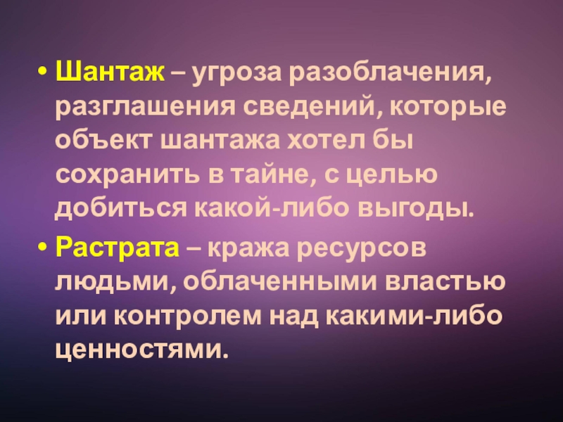 Слайд 28Шантаж – угроза разоблачения, разглашения сведений, которые объект шантажа хотел бы