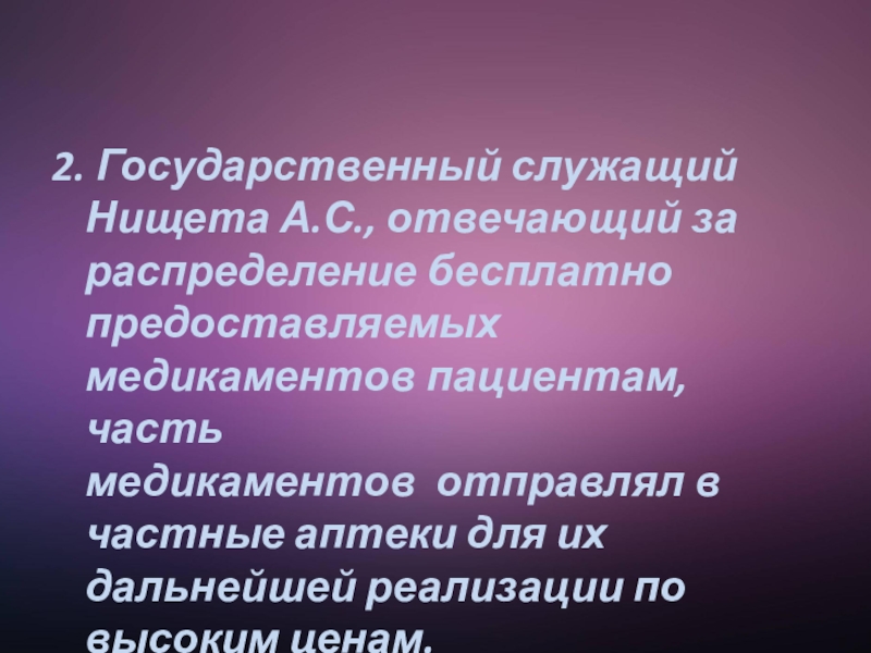 Слайд 332. Государственный служащий Нищета А.С., отвечающий за распределение бесплатно предоставляемых медикаментов