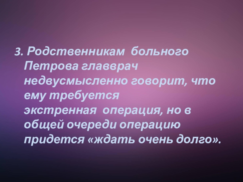 Слайд 343. Родственникам больного Петрова главврач недвусмысленно говорит, что ему требуется экстренная