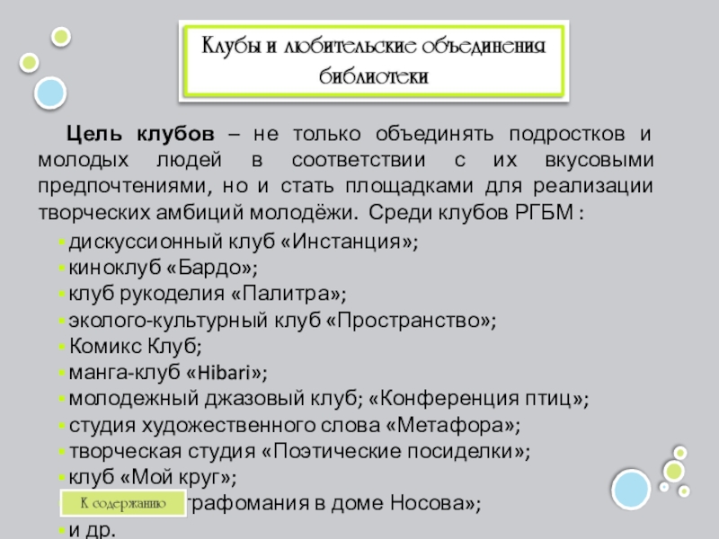 Цель клубов – не только объединять подростков и молодых людей в соответствии с их вкусовыми предпочтениями, но и стать площадками для реализации творческих амбиций молодёжи. Среди клубов РГБМ :