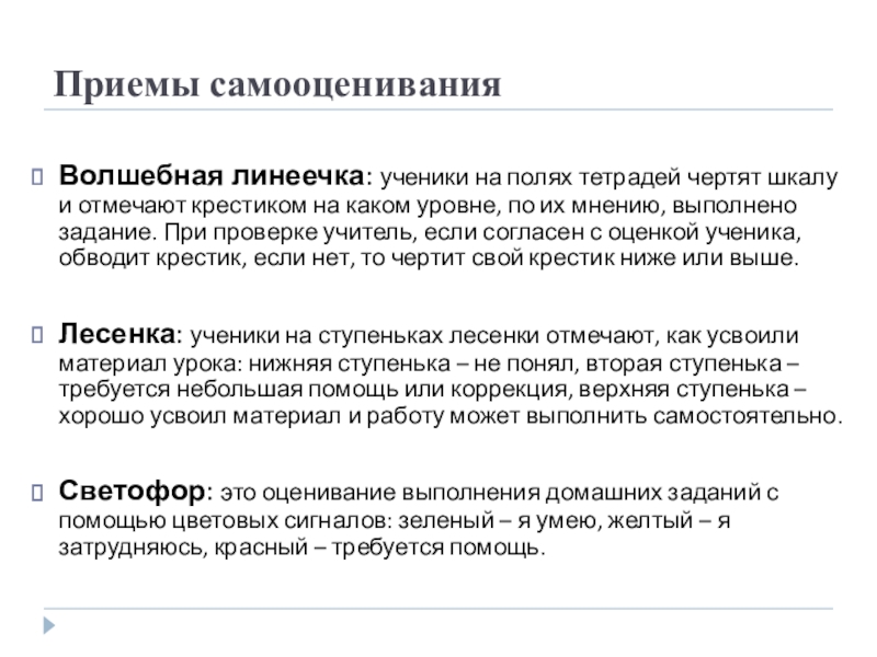 Приемы самооцениванияВолшебная линеечка: ученики на полях тетрадей чертят шкалу и отмечают крестиком на каком уровне, по их