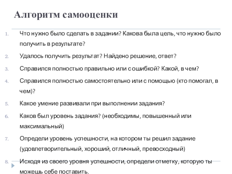 Алгоритм самооценки Что нужно было сделать в задании? Какова была цель, что нужно было получить в результате?Удалось