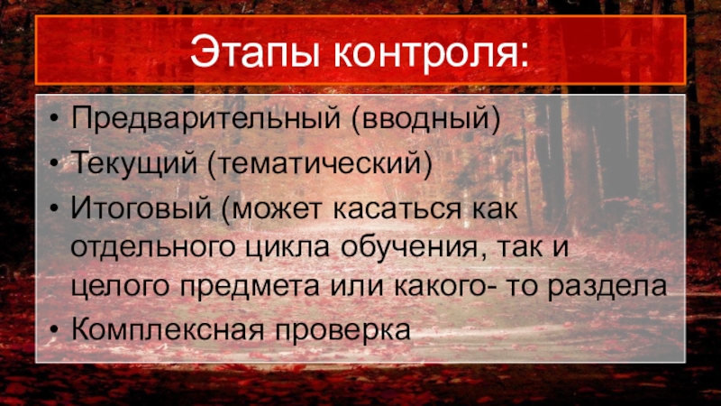 Этапы контроля:Предварительный (вводный)Текущий (тематический)Итоговый (может касаться как отдельного цикла обучения, так и целого предмета или какого- то