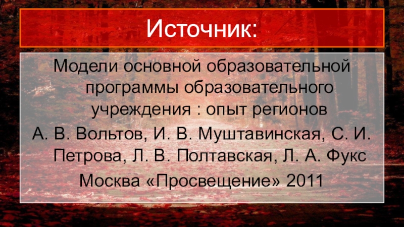 Источник:Модели основной образовательной программы образовательного учреждения : опыт регионовА. В. Вольтов, И. В. Муштавинская, С. И. Петрова,