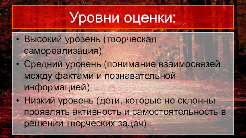 Уровни оценки:Высокий уровень (творческая самореализация)Средний уровень (понимание взаимосвязей между фактами и познавательной информацией)Низкий уровень (дети, которые не