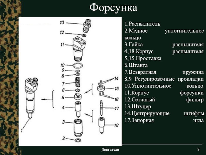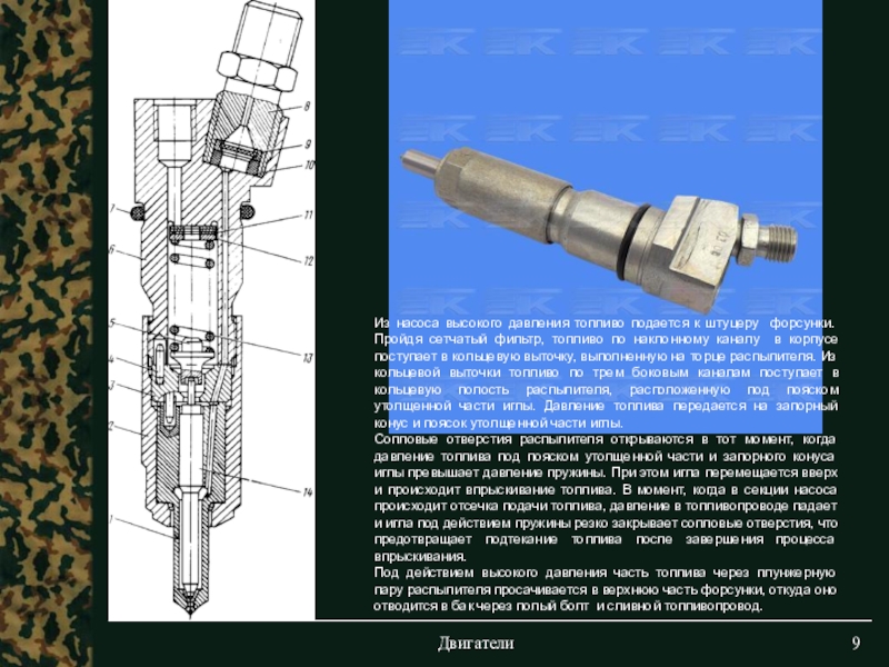 В дизелях топливо поступает от насоса высокого давления и посредством форсунки впрыскивается в цилиндры под давлением, в несколько раз превышающим давление воздуха в конце такта сжатия. Смесеобразование начинается с момента поступления топлива в цилиндр. При этом в результате трения о воздух струя топлива распыливается на мельчайшие частицы, которые образуют топливный факел конусообразной формы. Чем мельче распылено топливо и чем равномернее распределено оно в воздухе, тем полнее сгорают его частицы.